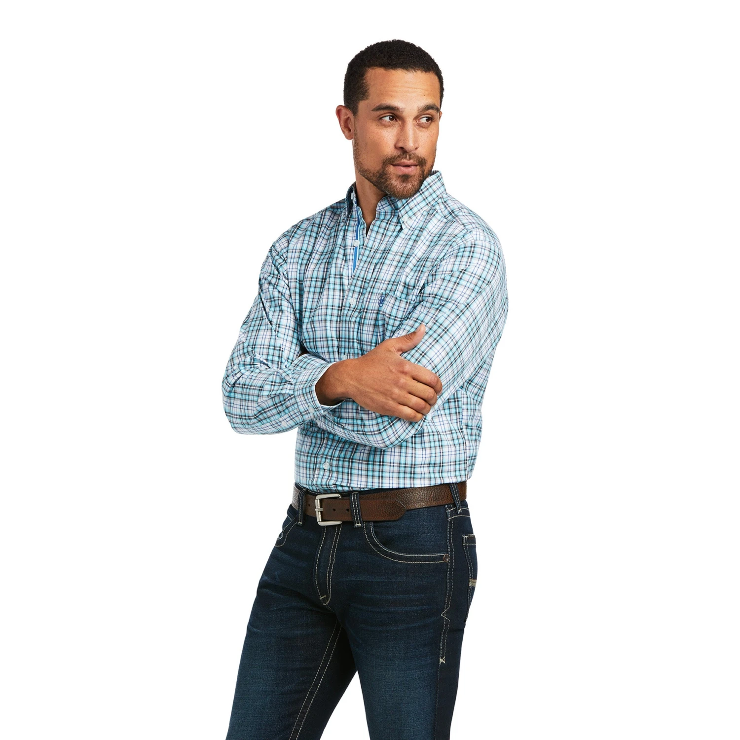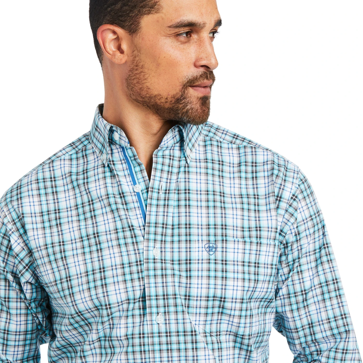 Blue and White Plaid Long Sleeve Isaiah Fitted Button Down Shirt.