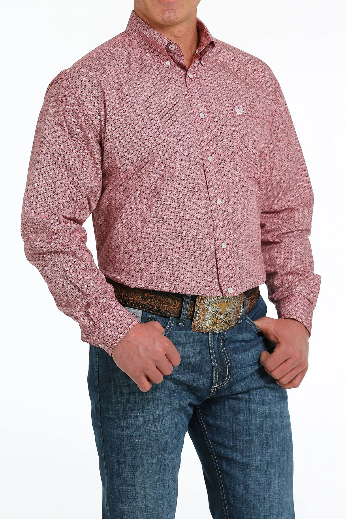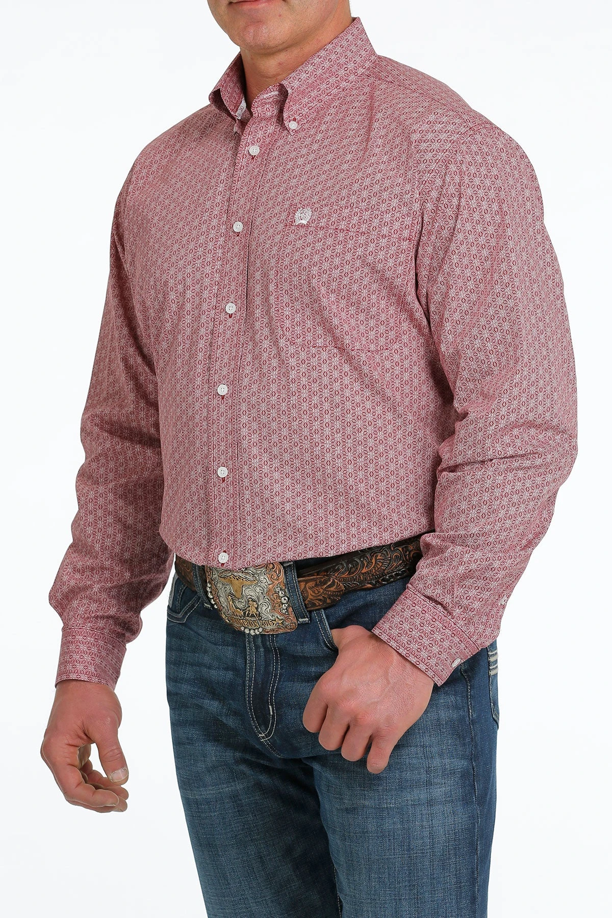 Burgundy and White Geometric Print Long Sleeve Button Down Shirt.