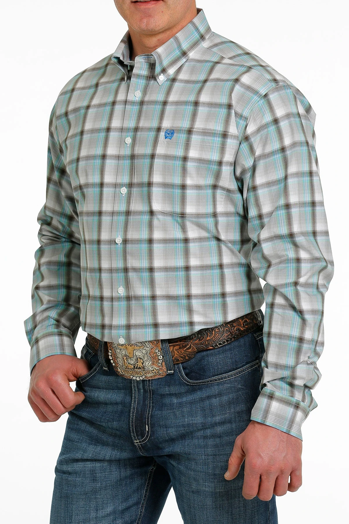 White, Green and Brown Plaid Long Sleeve Button Down Shirt.