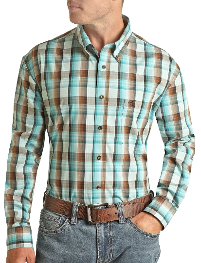 Teal and Brown Plaid Long Sleeve Button Down Shirt.