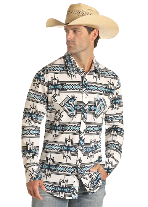 White with Blue and Grey Aztec Print Long Sleeve Snap Front Shirt.