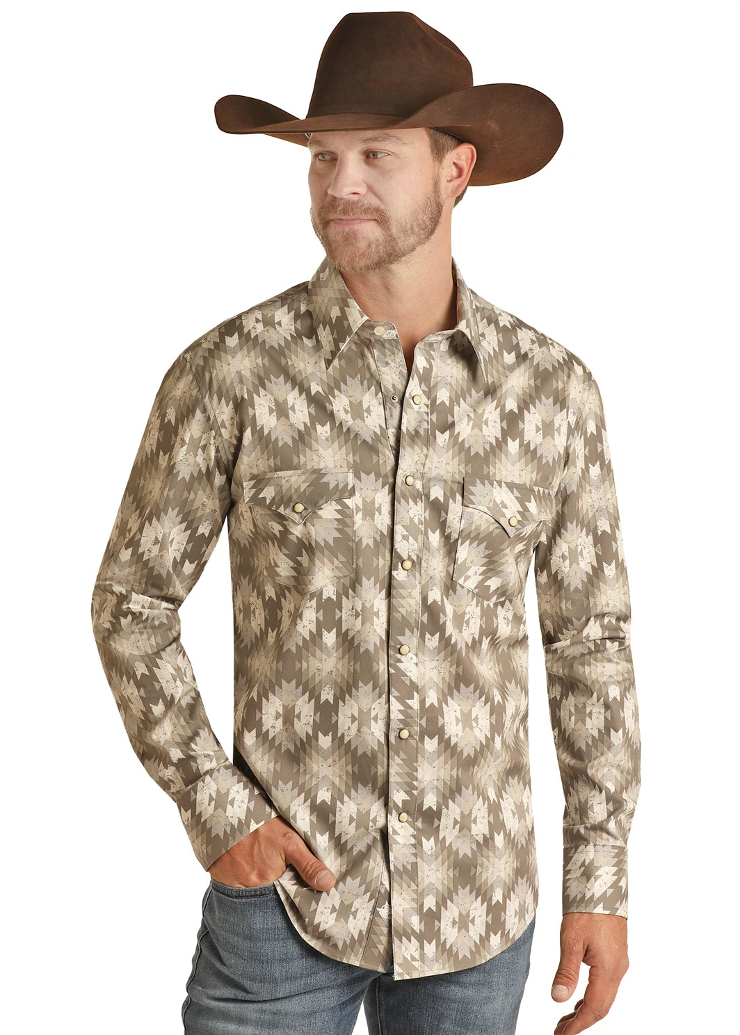 Multi Tan Aztec Print Long Sleeve Snap Front Shirt.