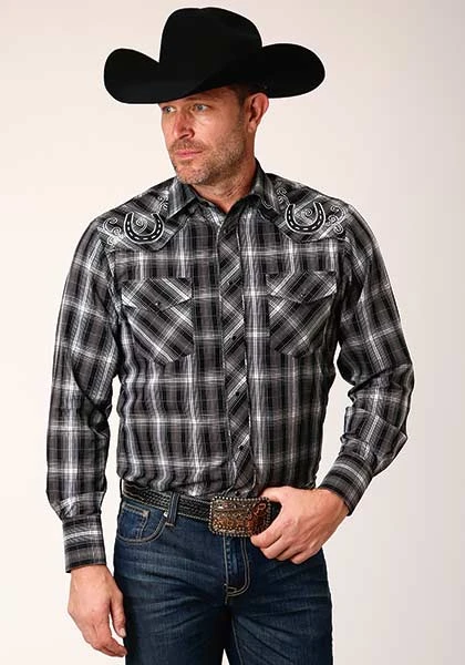 Black and White Plaid Long Sleeve Snap Front Shirt with Horseshoe Embroidery.