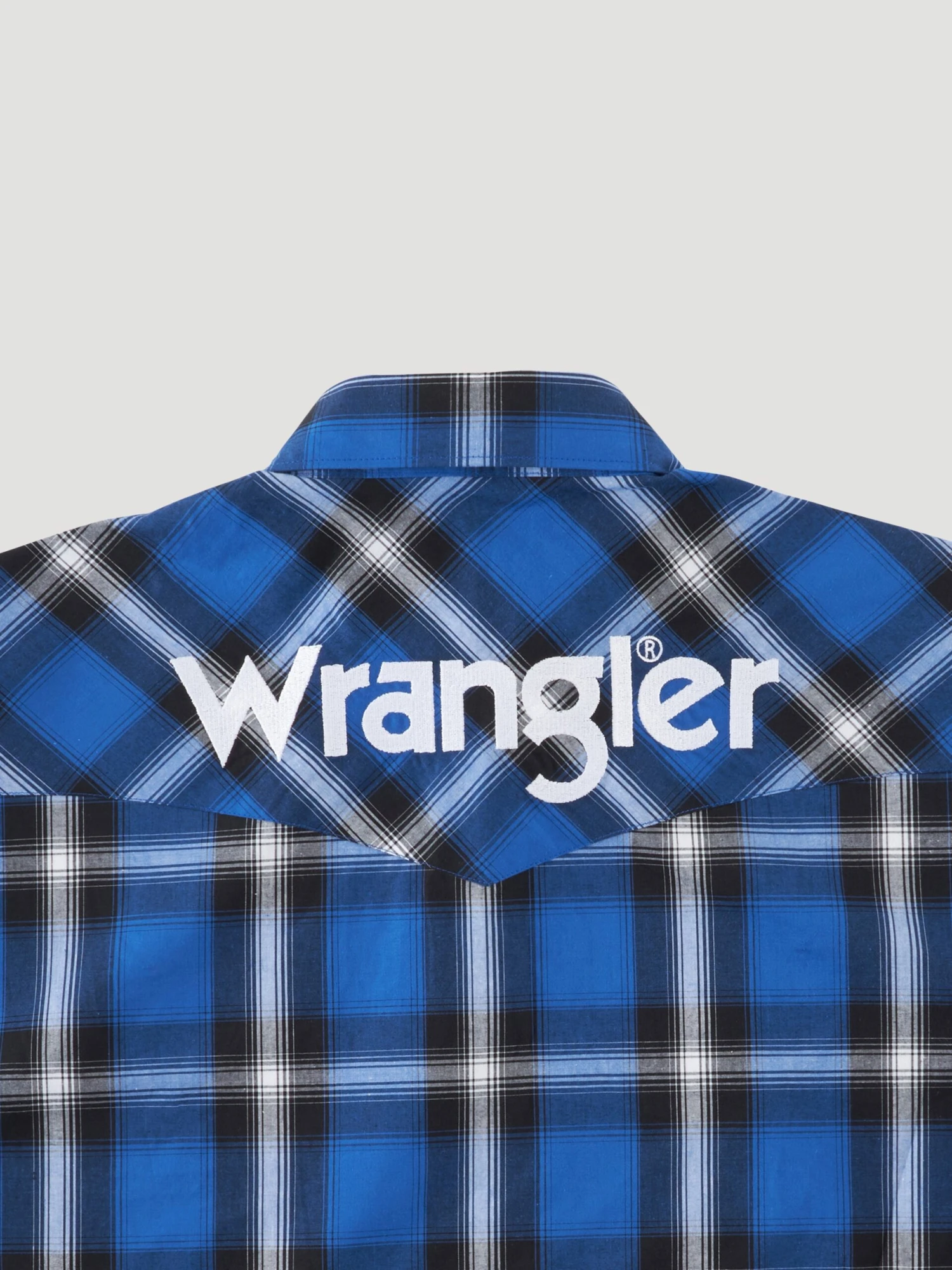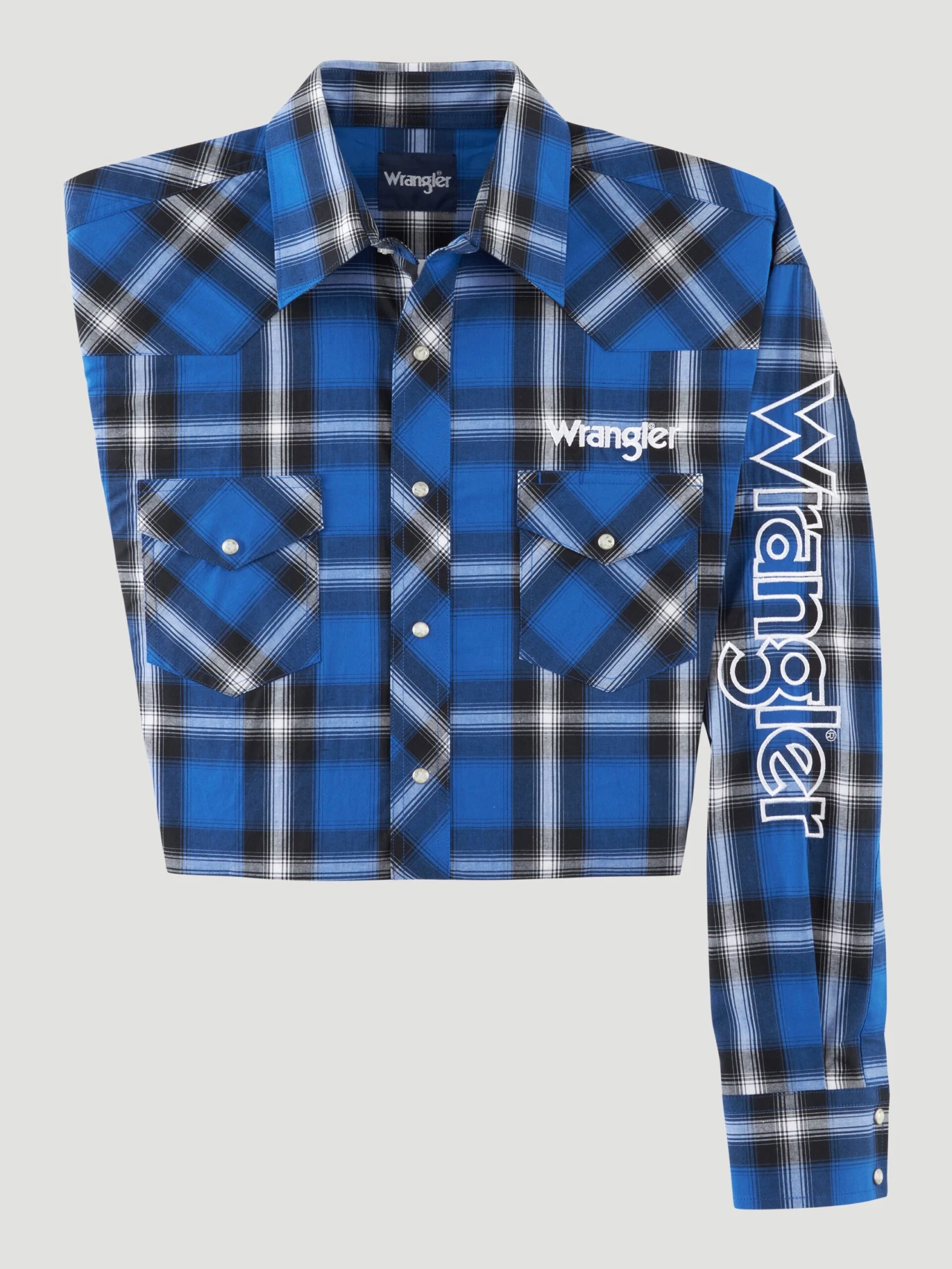 Blue and Black Plaid Long Sleeve Logo Snap Front Shirt.