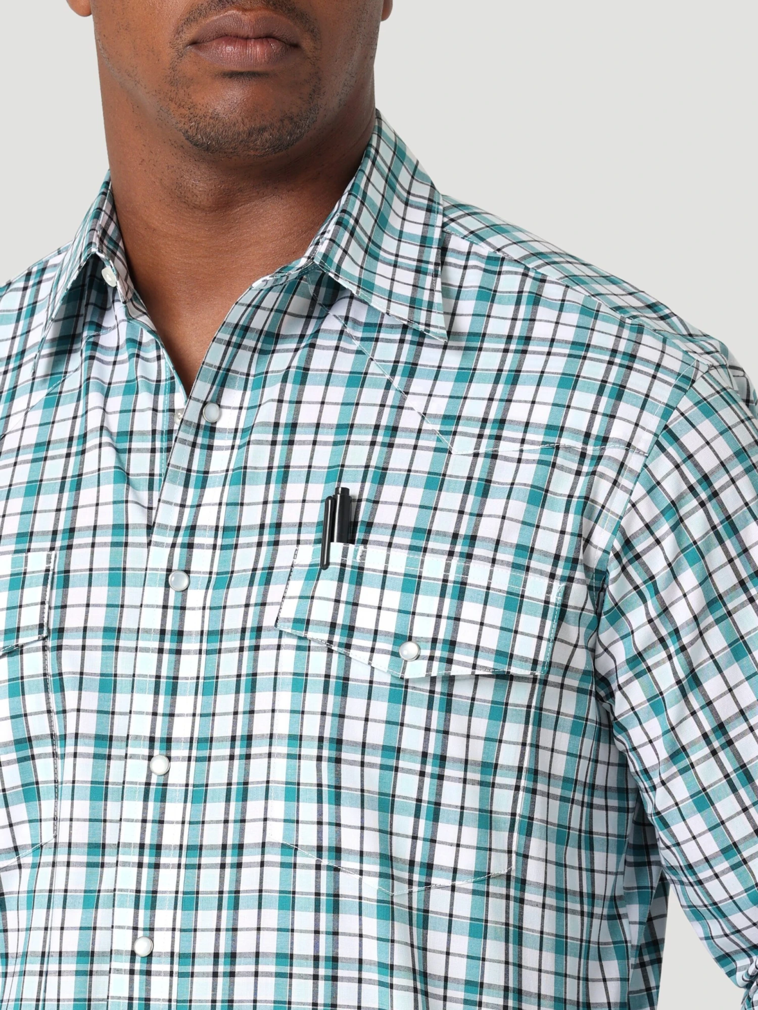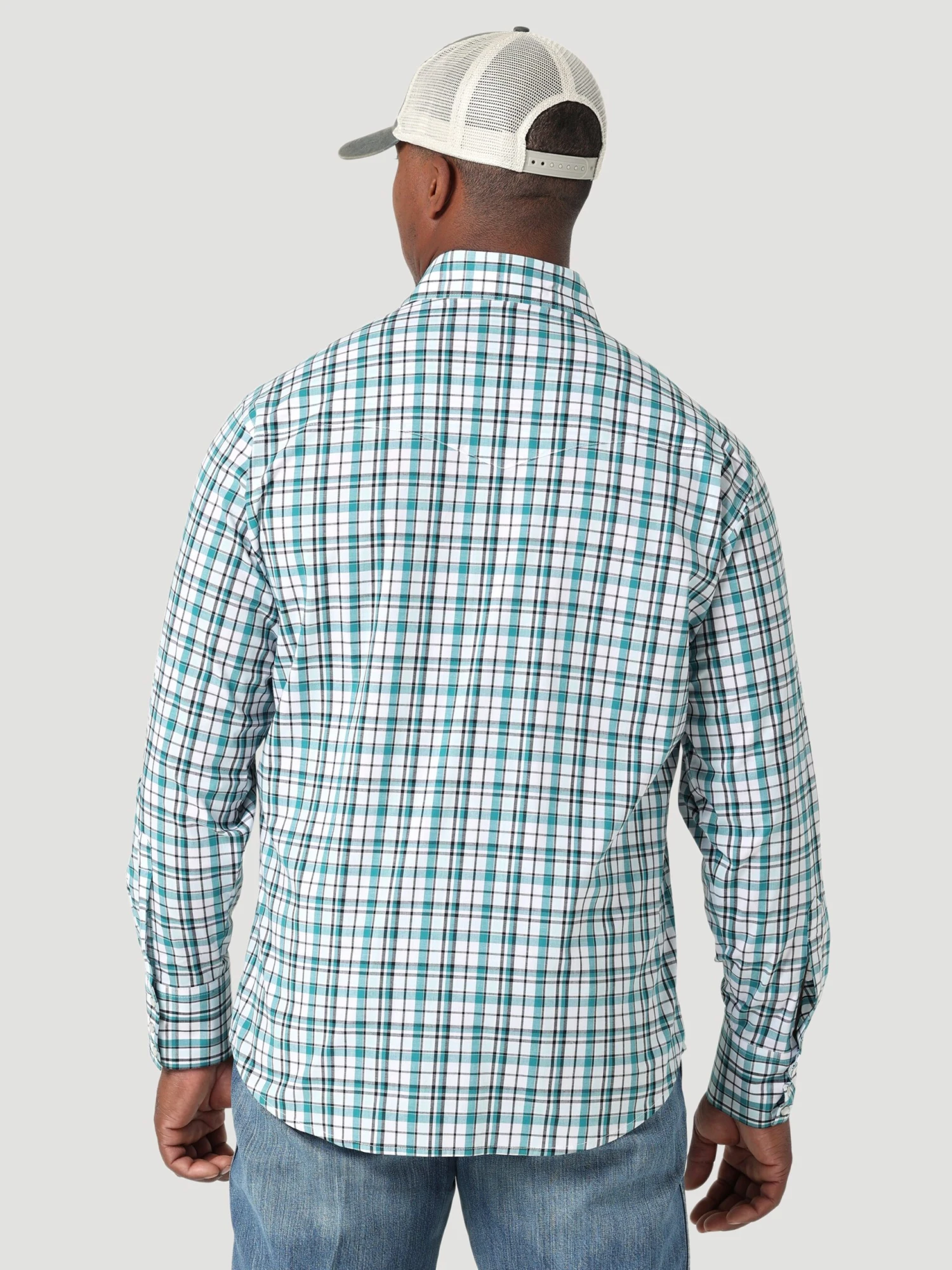 White and Teal Plaid Long Sleeve Snap Front Shirt.
