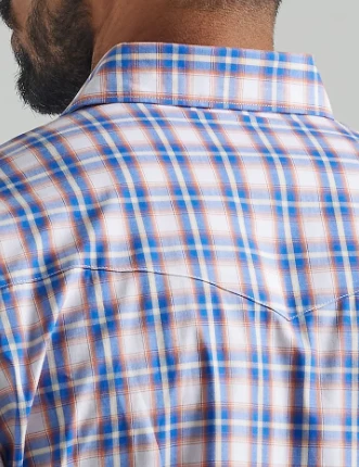 Blue and Orange Plaid Long Sleeve Wrinkle Resist Snap Front Shirt.